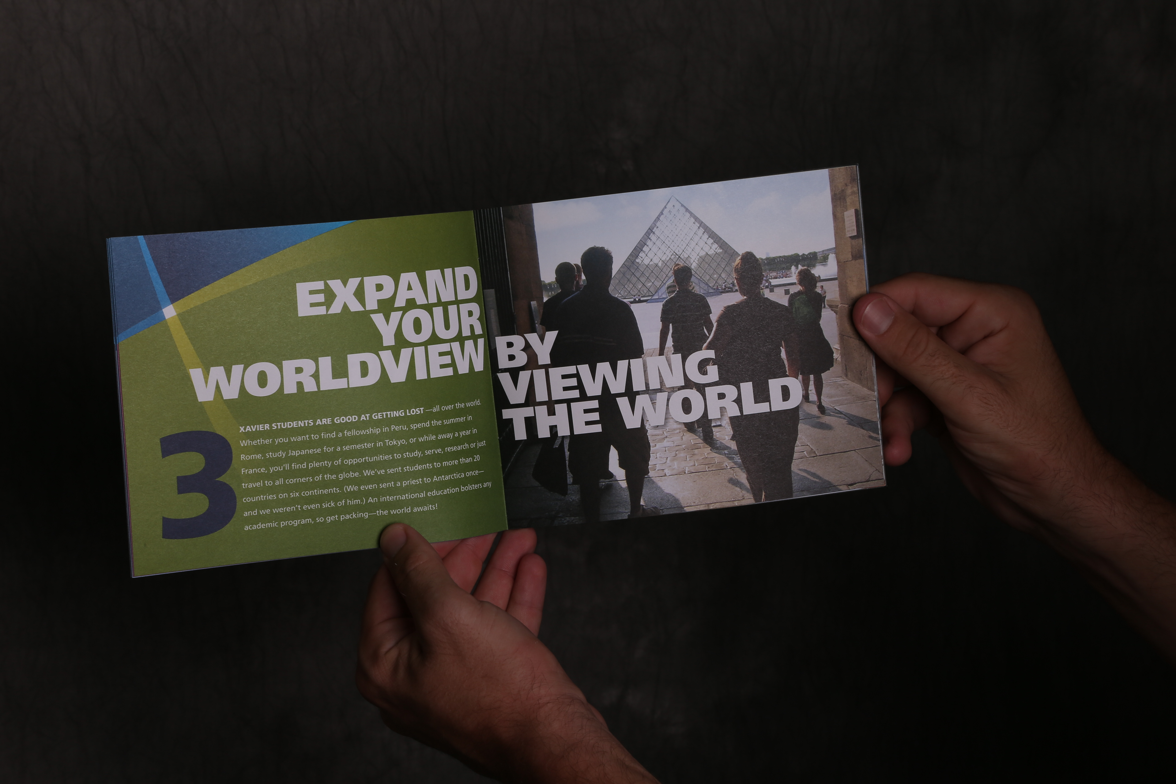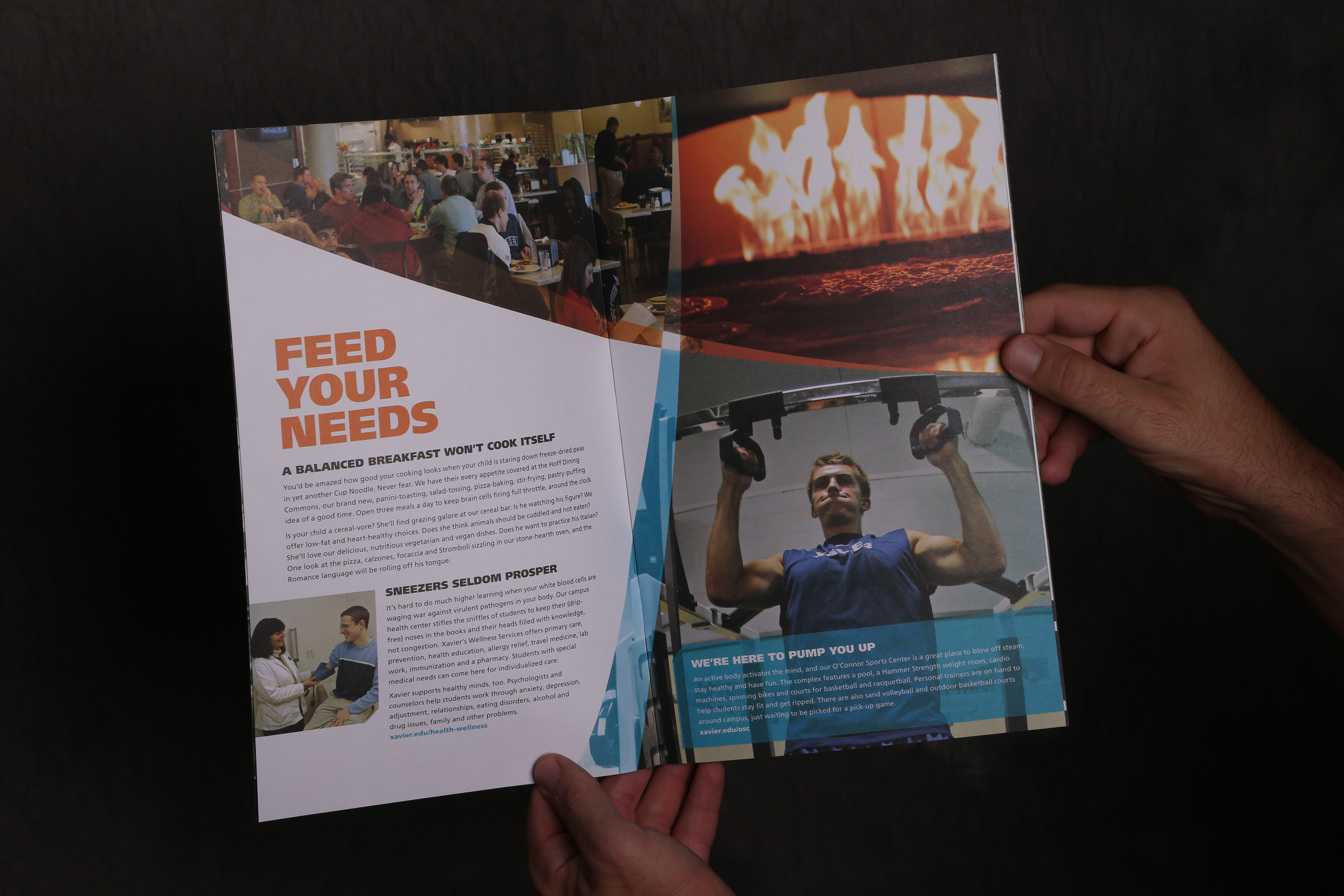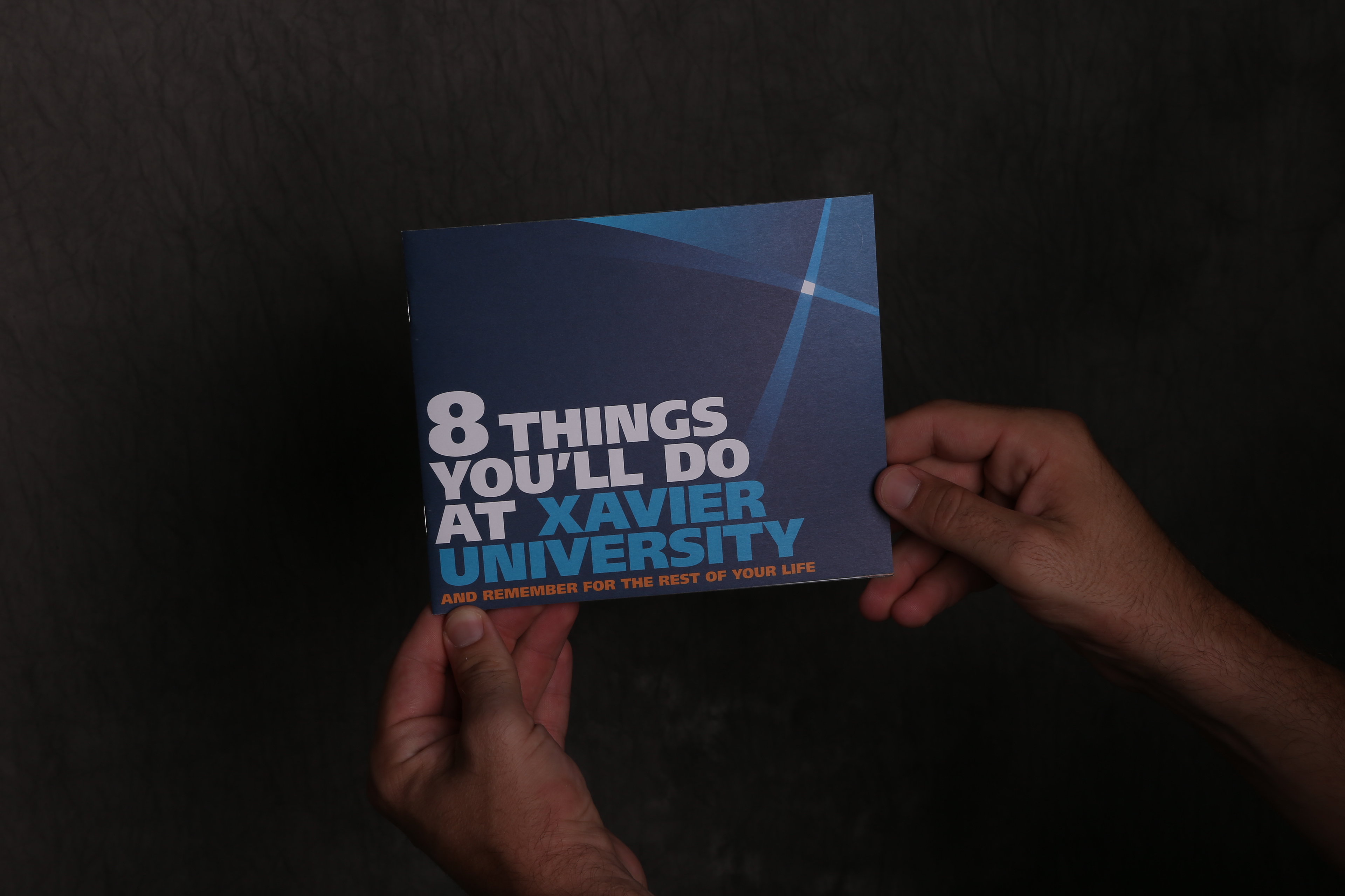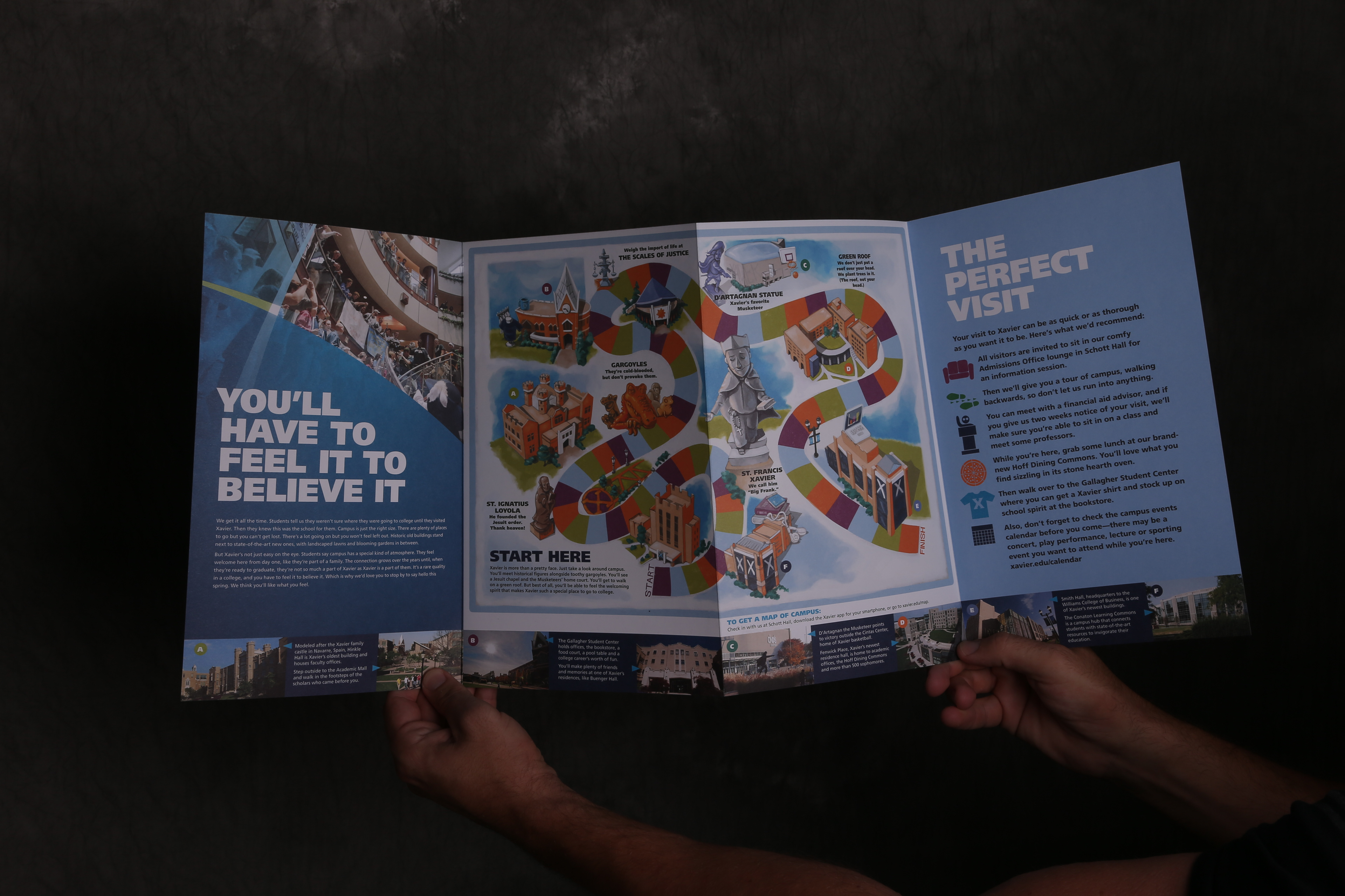 We used a marketing funnel perspective to map what milestones (investigating options, touring campuses, applying for financial aid, etc) and created a series of pieces to give a prospective applicant the information about us at hand for each decision point in the line. It started with a small teaser piece called "8 things you'll do at Xavier University" using creative photography to highlight memorable and unique parts of the XU experience. It came with a pre-printed visitor parking pass so that the family could visit the University on their own terms. This was followed by a larger general piece that gave an overview of everything Xavier had to offer. The next was "Value" which focused on the medium-sized "just right" option and justified the cost of tuition with the depth of the experience. Next was the "Family" brochure which was structured to follow Maslow's Heirarchy of Needs so that we could give the parents the information about how the university covers the student's needs as a place to live, a place to learn, and a place to grow. The series ended with the "Visit" piece that gave details on how to schedule a tour, an illustrated CandyLand-style map for a self-guided tour, and other relevant details.
