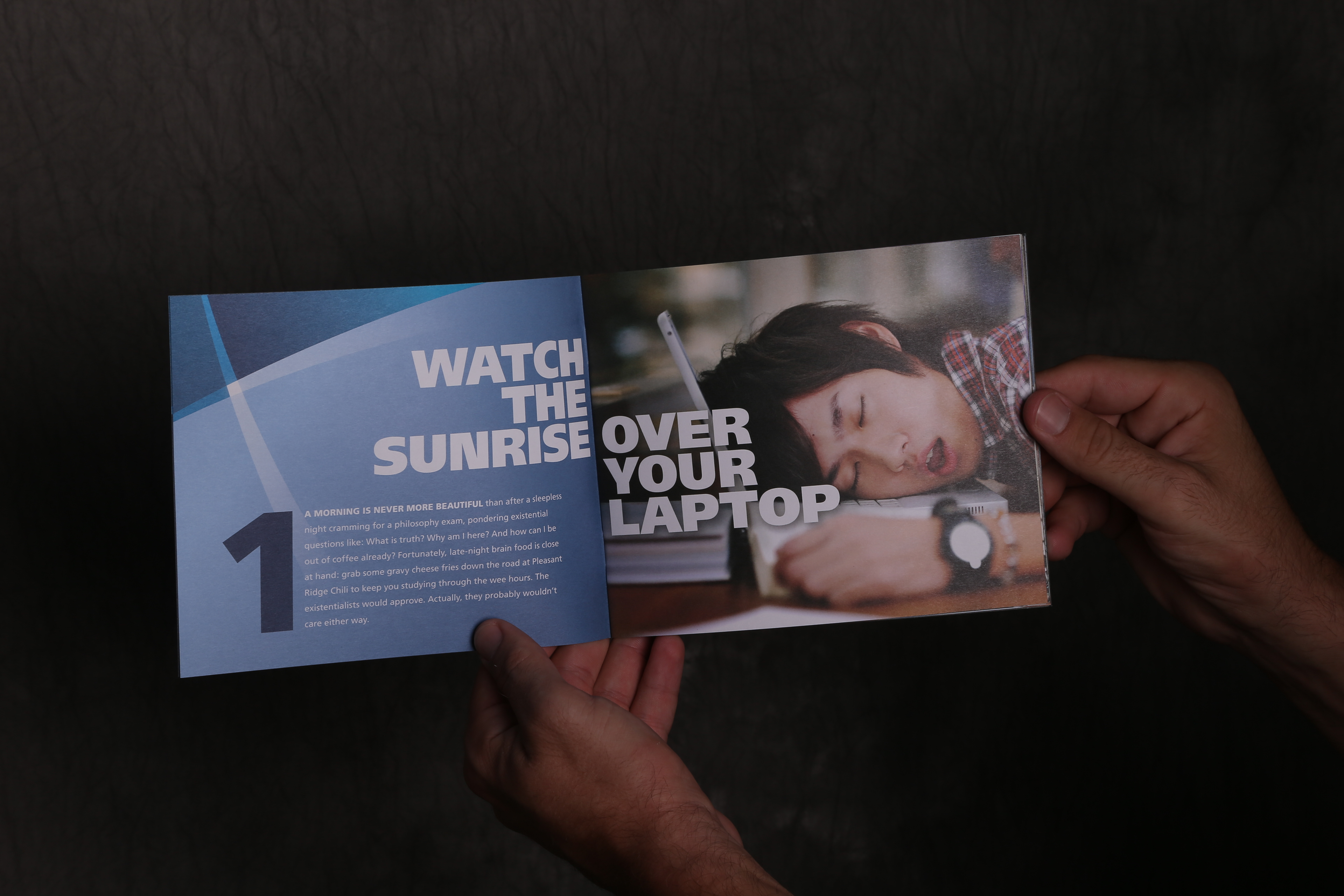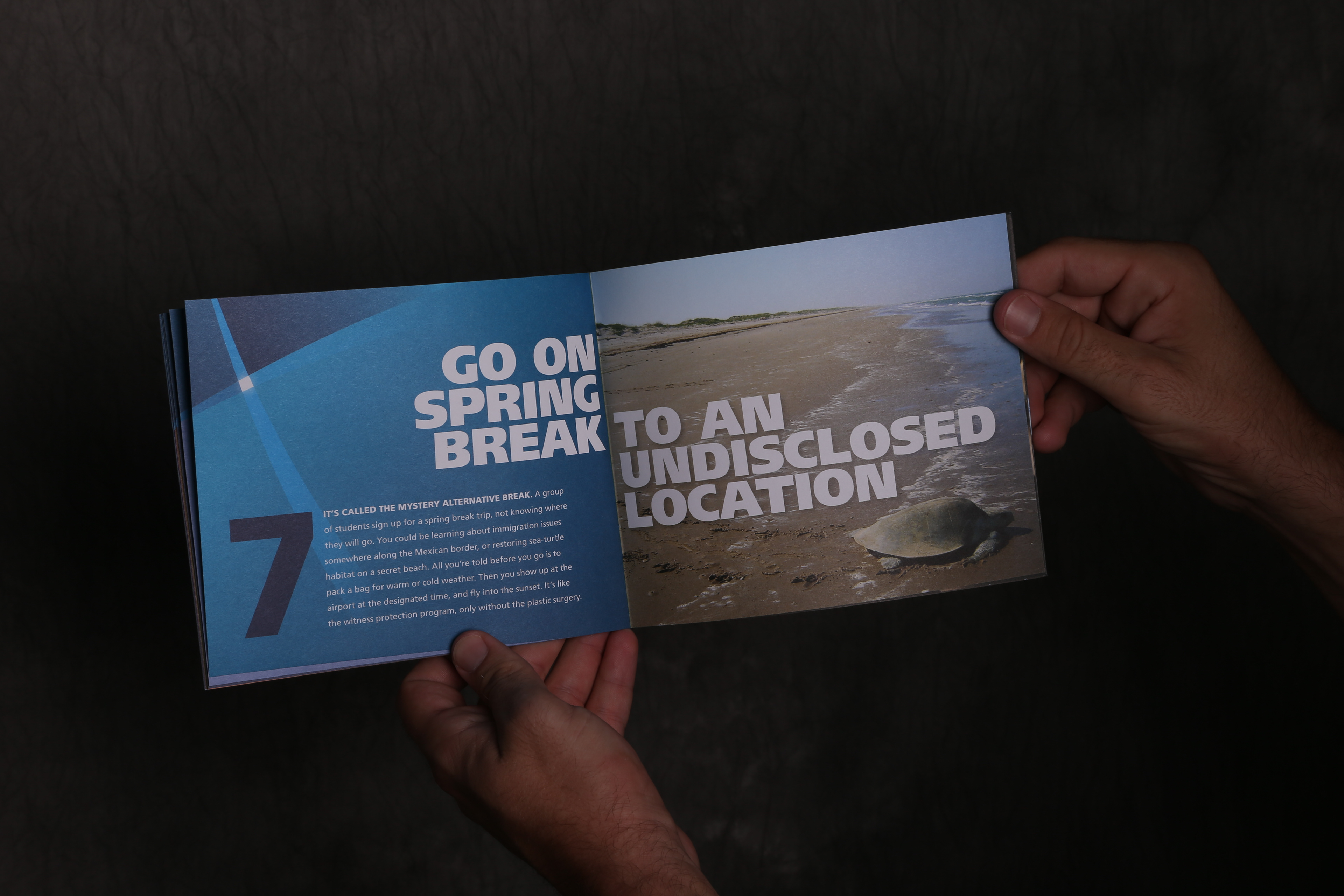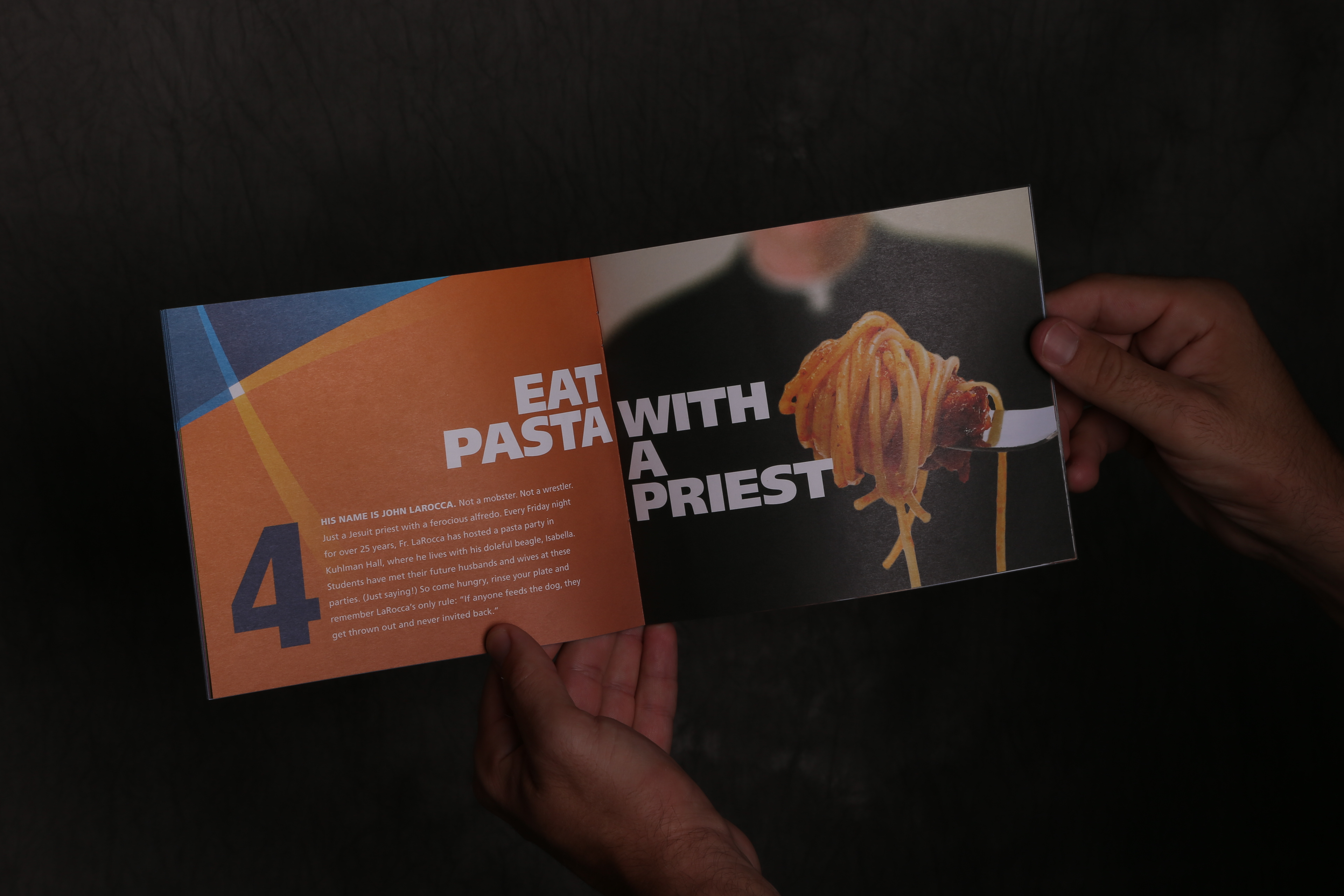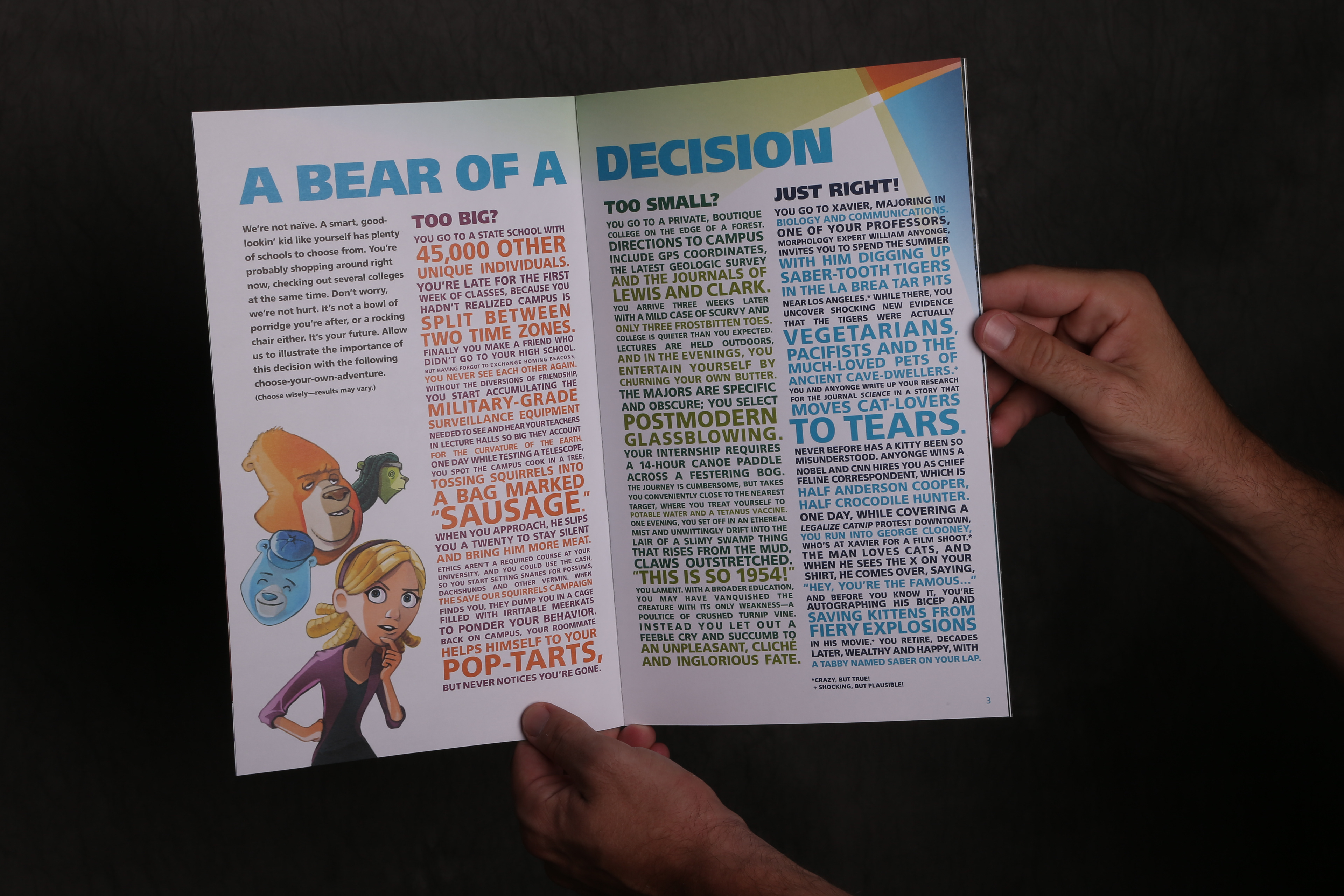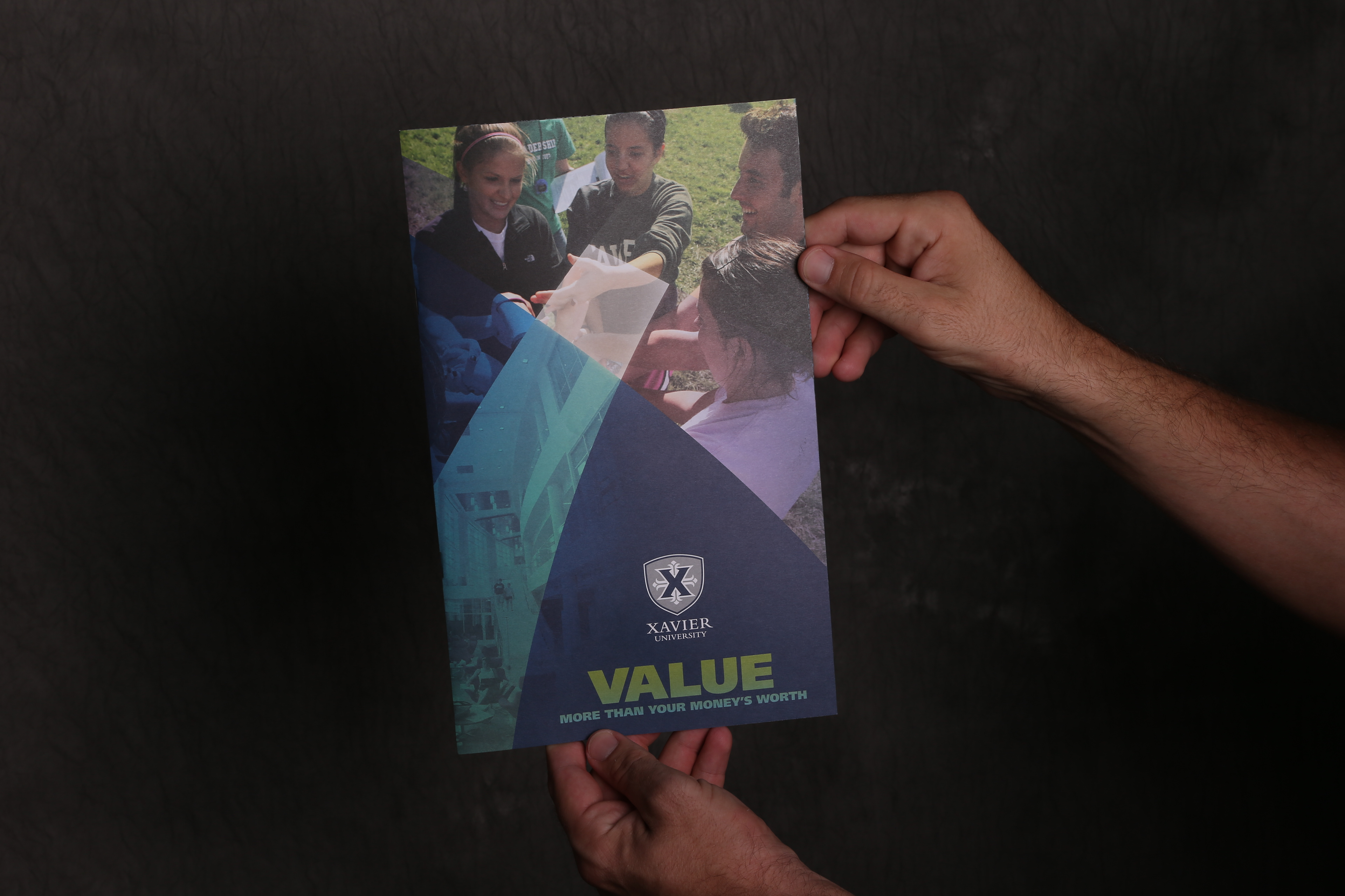 We used a marketing funnel perspective to map what milestones (investigating options, touring campuses, applying for financial aid, etc) and created a series of pieces to give a prospective applicant the information about us at hand for each decision point in the line. It started with a small teaser piece called "8 things you'll do at Xavier University" using creative photography to highlight memorable and unique parts of the XU experience. It came with a pre-printed visitor parking pass so that the family could visit the University on their own terms. This was followed by a larger general piece that gave an overview of everything Xavier had to offer. The next was "Value" which focused on the medium-sized "just right" option and justified the cost of tuition with the depth of the experience. Next was the "Family" brochure which was structured to follow Maslow's Heirarchy of Needs so that we could give the parents the information about how the university covers the student's needs as a place to live, a place to learn, and a place to grow. The series ended with the "Visit" piece that gave details on how to schedule a tour, an illustrated CandyLand-style map for a self-guided tour, and other relevant details.